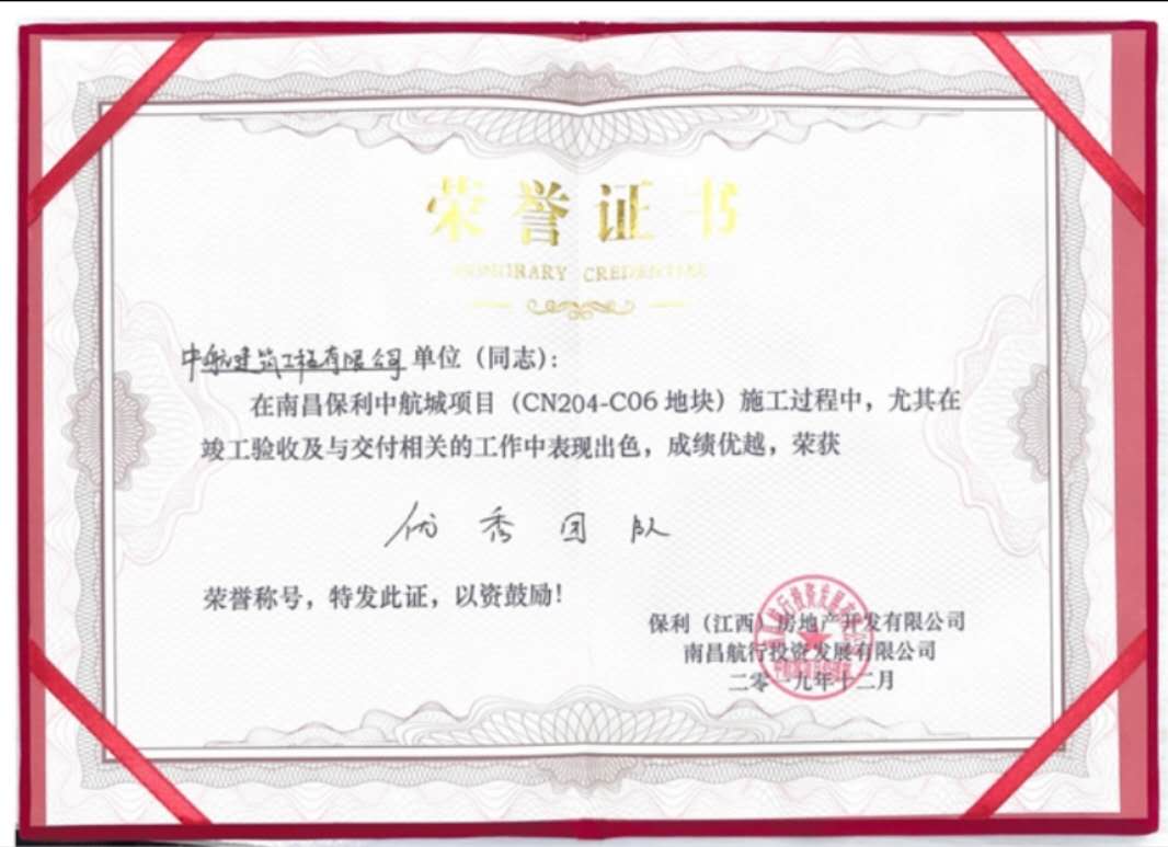 近日,我司南昌中航城一期--CN204-C06項(xiàng)目收到了由保利(江西)房地產(chǎn)開發(fā)有限公司及南昌航行投資發(fā)展有限公司頒發(fā)的“優(yōu)秀團(tuán)隊(duì)”證書,這是公司項(xiàng)目業(yè)績(jī)上的又一亮點(diǎn)。