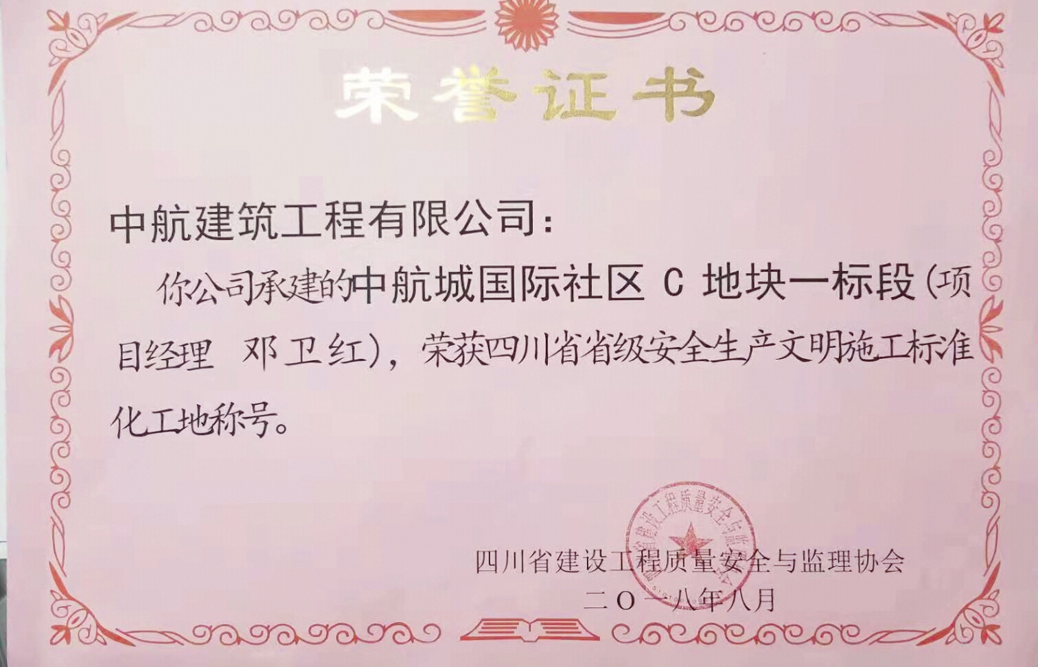 2018年8月2日,四川省南充市中航城國際社區(qū)C地塊一標(biāo)段項(xiàng)目部再傳捷報(bào),順利通過四川省建設(shè)工程質(zhì)量安全監(jiān)督總站標(biāo)化工地驗(yàn)收,獲評“四川省安全生產(chǎn)文明施工標(biāo)準(zhǔn)化工地”。