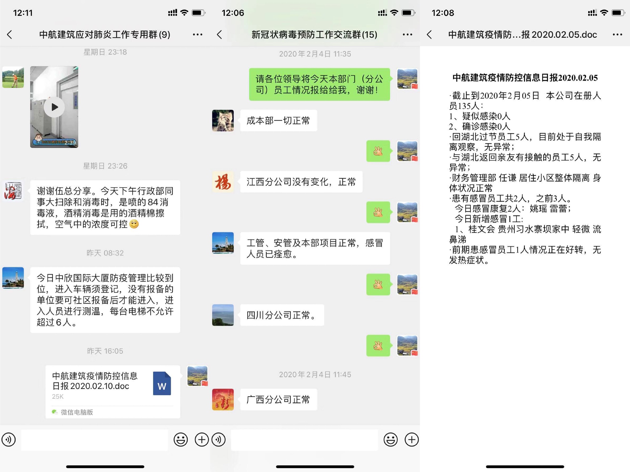 新型冠狀病毒感染肺炎疫情的發(fā)生,舉國上下眾志成城,共克時艱。中航建筑堅決落實黨中央、國務(wù)院的決策部署,全面防控,科學(xué)調(diào)度。董事長伍倜緊急指示成立“中航建筑應(yīng)對新冠肺炎工作組”及“新冠肺炎預(yù)防工作交流群”,公司連夜出臺《中航建筑工程有限公司防控預(yù)案》,多次通過線上會議強調(diào)防控工作的重要性,普及防控知識,并要求每日收集公司在冊人員疫情信息并匯總上報,包括身體狀況,是否接觸湖北地區(qū)人員,及居住地所在社區(qū)街道的應(yīng)對措施調(diào)查等全方位收集統(tǒng)計。